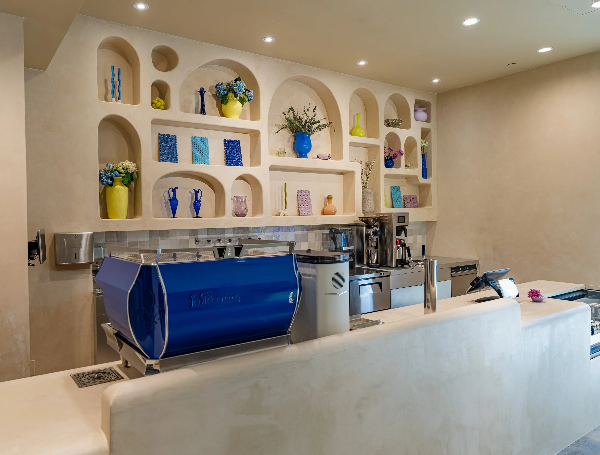A gut renovation on a former live music venue transformed to a cafe and personal training gym. Custom millwork installed at the entrance and cafe. Bespoke concrete microcement bar and seating area on the ground floor and an addition of restrooms, showers and vanity area in the cellar level.